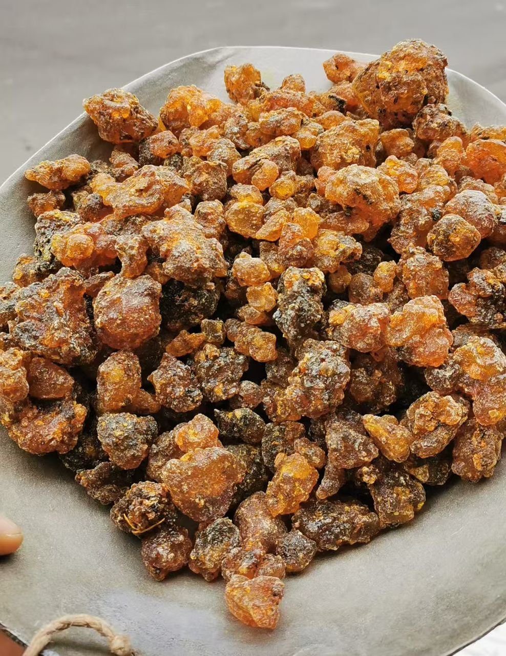 The resin is typically collected after the tree is tapped, and the resin hardens into "tears"